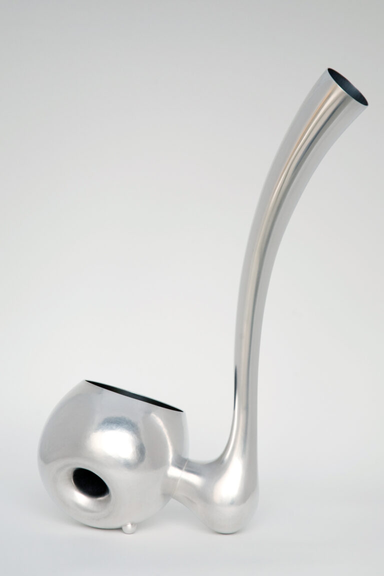 “A gentle pebble-like adult form grows with solid strength. Internally a tube growth is still young – and powerful. It finds a point to burst through its briefly nurturing external and pushes out quickly. There’s a pause once it’s out, slowing turning downward to gather energy. Suddenly it shoots upward – gaining in strength and width with its bright polished end signifying fresh energy and all its potential.”